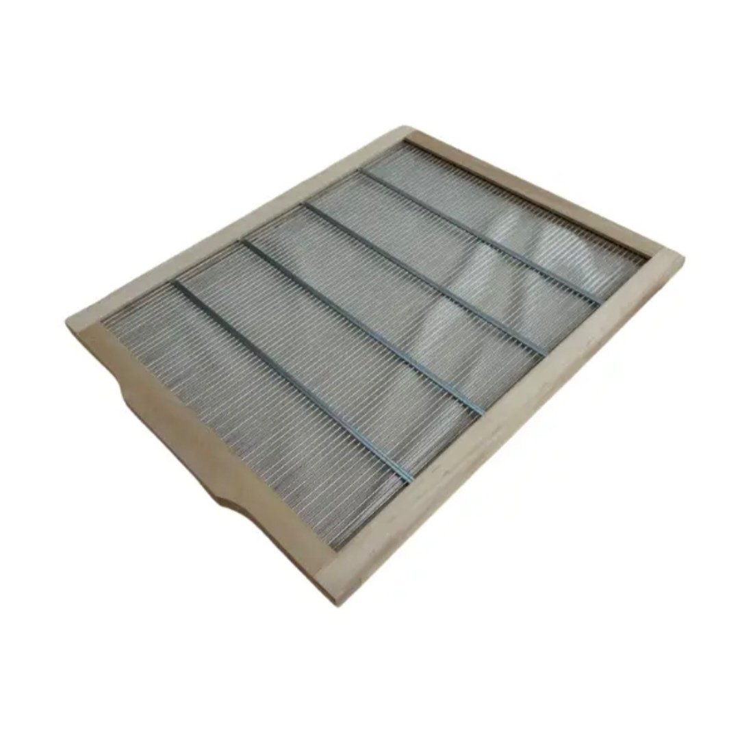 Uokvirena matična rešetka izrađena je od kvalitetnog drveta i čvrste mreže. Osigurava stabilnost i dugotrajnu upotrebu. Konstrukcija rešetke sprječava pomicanje i oštećenje tijekom rada. Precizno izrađena mreža omogućuje optimalan protok zraka, čime se održavaju zdravi uvjeti unutar košnice.