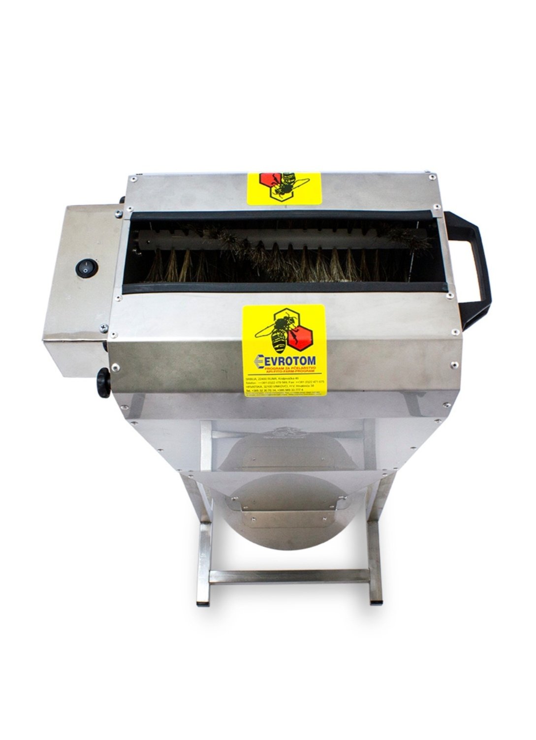 Ovaj ometač pčela omogućuje precizno, sigurno i učinkovito rukovanje pčelama. Rotirajuće četke osiguravaju ravnomjerno uklanjanje pčela s okvira, dok inox kanta doprinosi stabilnosti i dugotrajnoj funkcionalnosti alata. Lagana konstrukcija olakšava rukovanje strojem te omogućuje jednostavno čišćenje i održavanje.